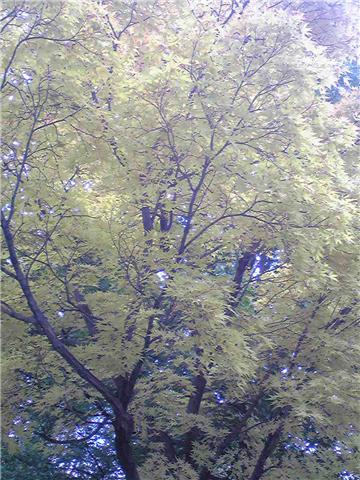 紅葉の中もみじなどの下にちょうが休んでいます。