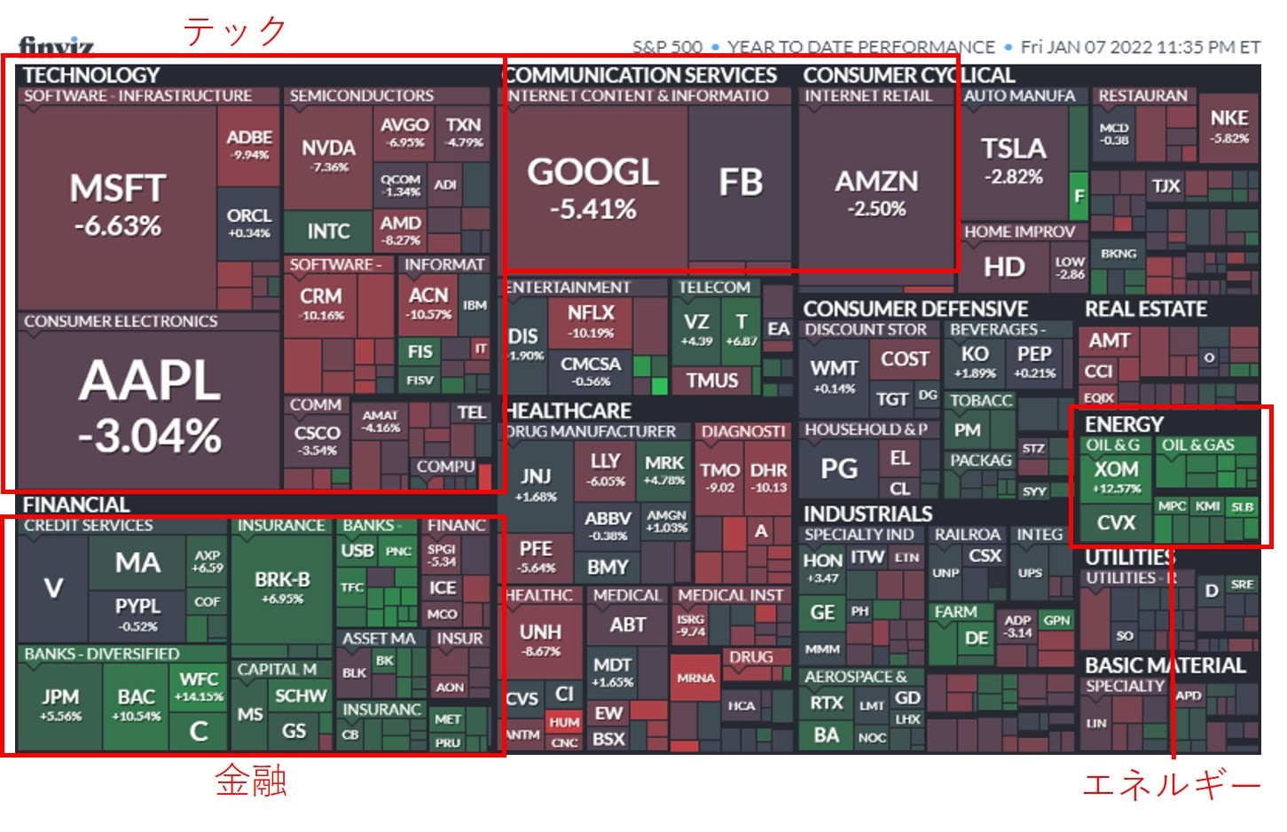 このサイトから"Maps">> "S&P500" + "Year to Date Performance" と選ぶと、年初来の騰落率がわかります。図を添付します。年初からの1週間でどのセクターが上がったかをみると、やはりテックセクターがマイナスになっています。Google $GOOGL やマイクロソフト $MSFT が-5%以上になっているのは珍しいです。