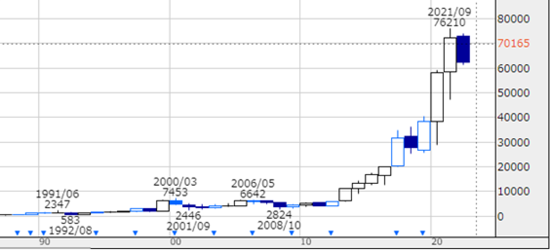 画像は、キーエンスの長期チャート(上場からの年足のチャート)です。