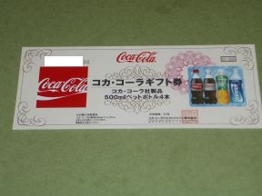 のコカコーラ社ギフト券(1枚で500ml製品4本と引換え) がもらえます。このギフトカードはスーパー等では1枚588円の商品券としてコカコーラ社以外の商品の買い物にも使用できますので。
