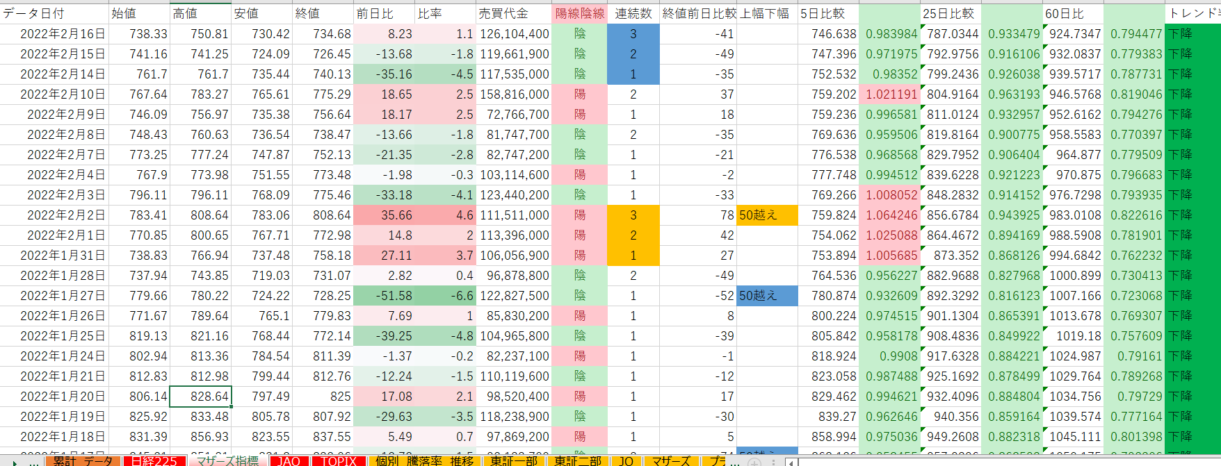 日の値上がり銘柄数率平均の月単位が47~53%に