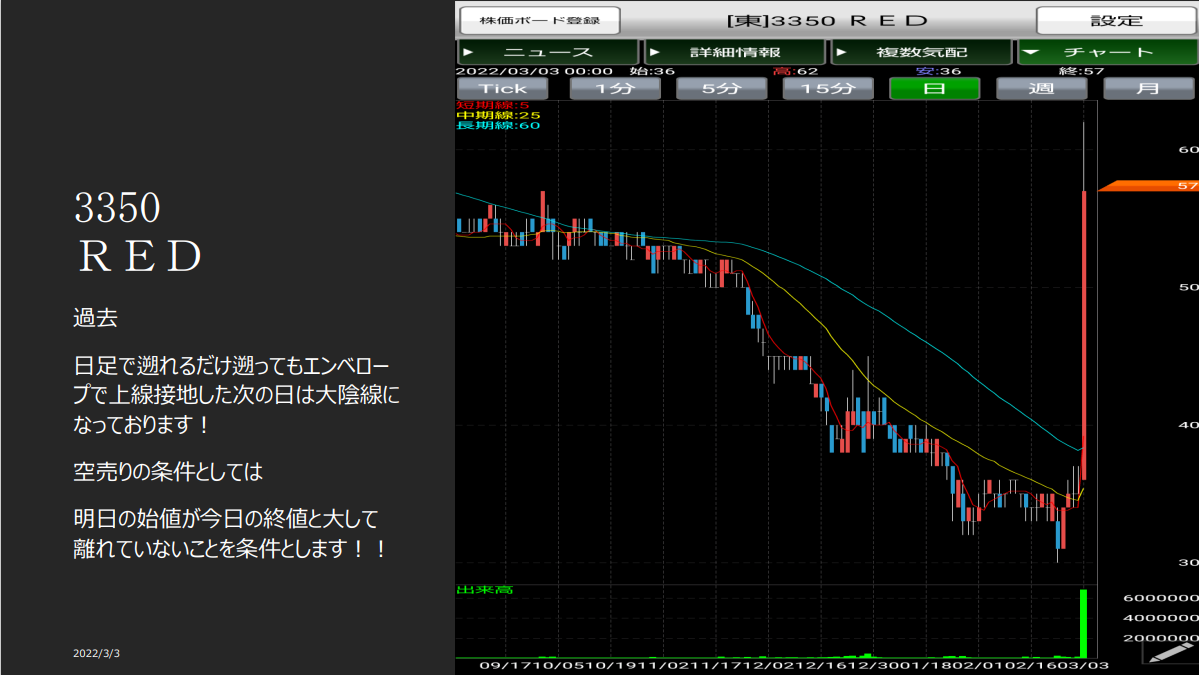 3350 RED (本日東証全体NO1値下がりの1日空売りを推奨)