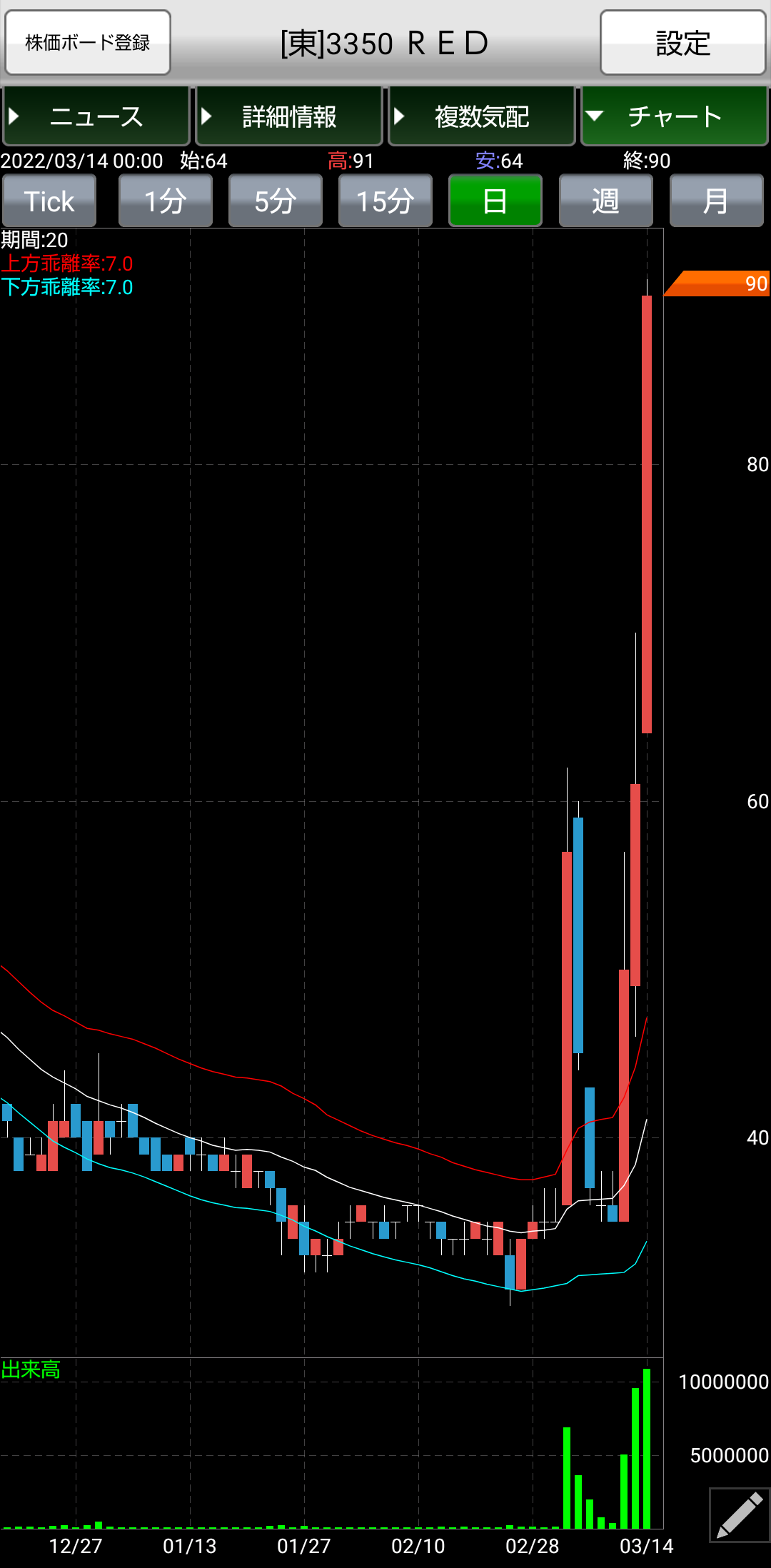 今日 前日終値 61円 ⇒ 終値 90円 (上昇率 47.54%)