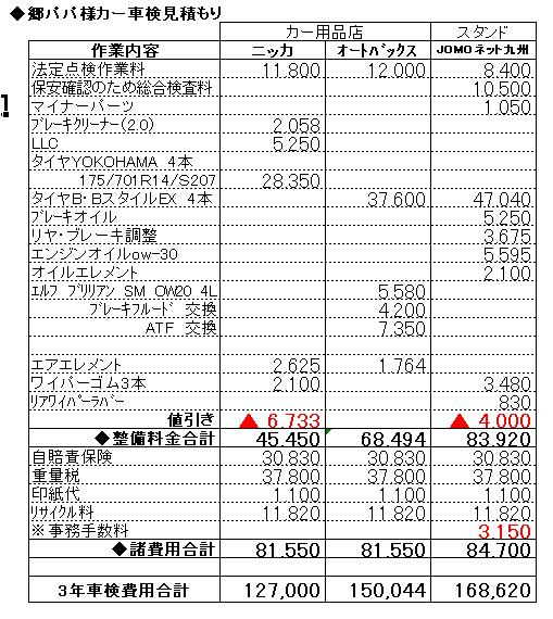 ・郷のマーチくんは、蛙さん無しで格安っ♪パパ吉はタイヤの交換とリサイクル料を加味しても127千円と、マズマズの結果ですじゃ