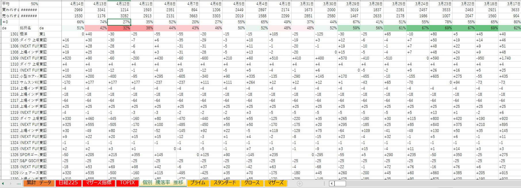 緑色 ⇒ 過熱相場、買われすぎているため売り推奨