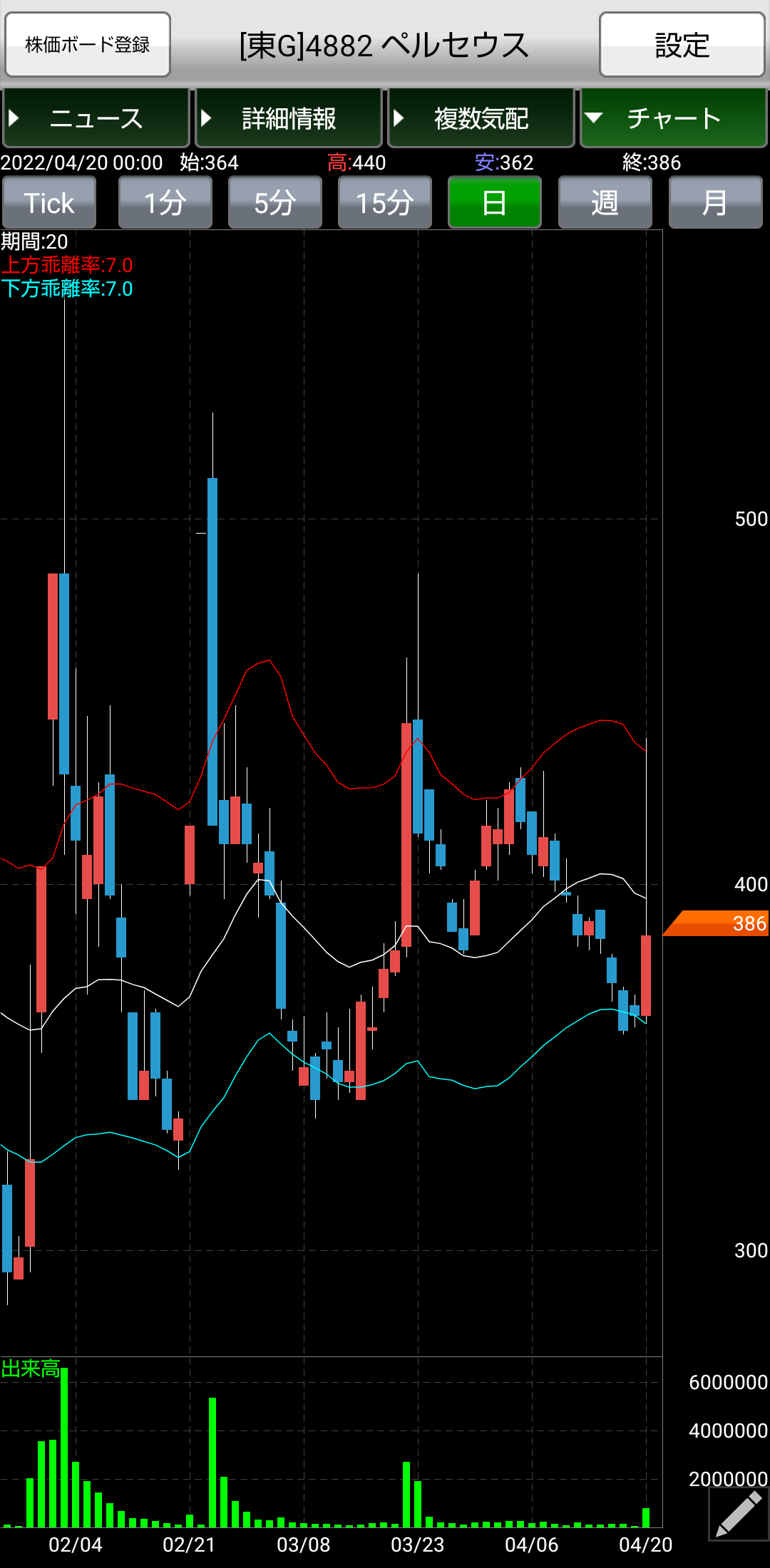 今日 終値 396円(9%増)