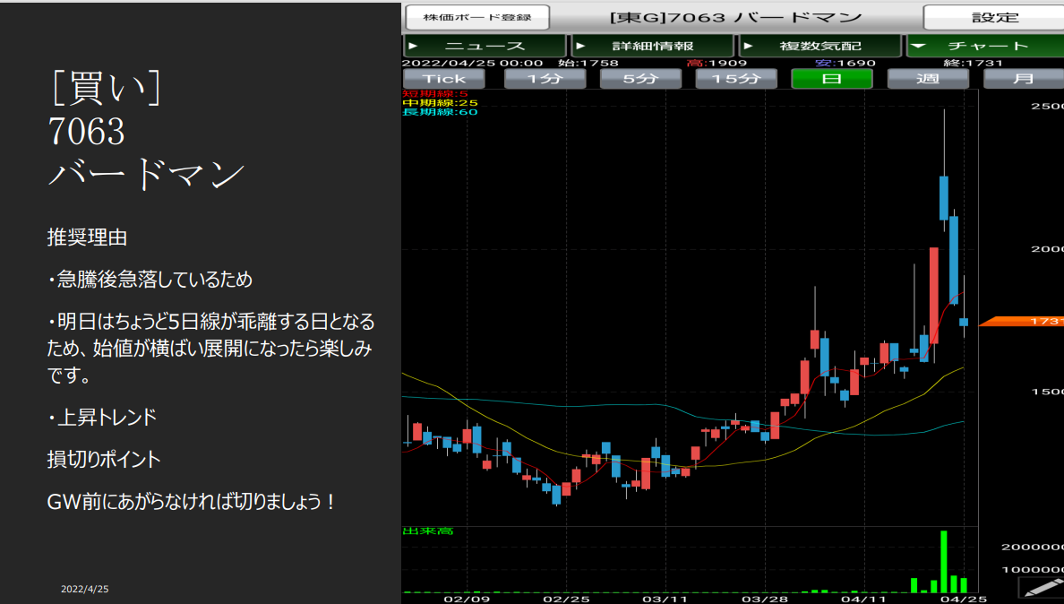 推奨、二日でストップ高を達成しました。