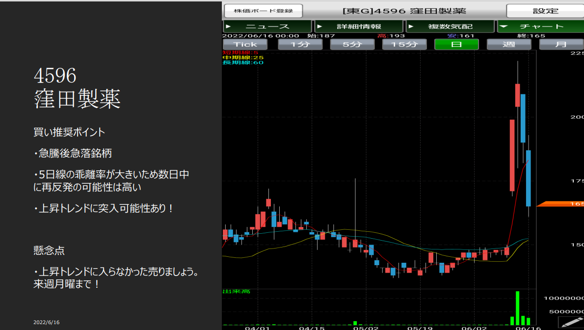 ※1枚目 4596 窪田製薬の推奨時画像 ストップ高1回