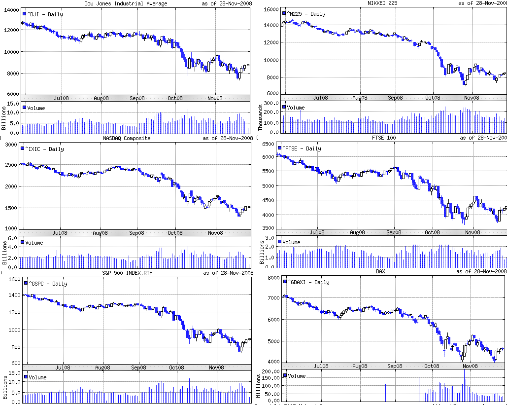 週間では、ダウは+9.7%、ナスダック指数は+10.9%、S&P500は+12.0%でした。ダウは月曜は+396ドル、火曜は+36ドル、水曜は+247ドル、木曜は休場で、金曜は+102ドルと連騰しました。先週金曜から5連騰で、ダウの5連騰は2007年の7月以来、5日間の上昇率は1932年以降で最大となりました。シティグループの救済、Fedの新たな金融対策、オバマ次期大統領の経済チーム発表など、政府や金融当局からの対策発表が相次いだことが好感された形となりましたが、おそらく需給がよくなった最大の要因は、ファンド勢の解約期限を過ぎたことで売り圧力が小さくなったことでしょう。売り板が薄い中をスルスルと上がっていった感じで、出来高も少なかったです。11月最終週から需給が良くなる・・・アノマリー通りの動きでした。