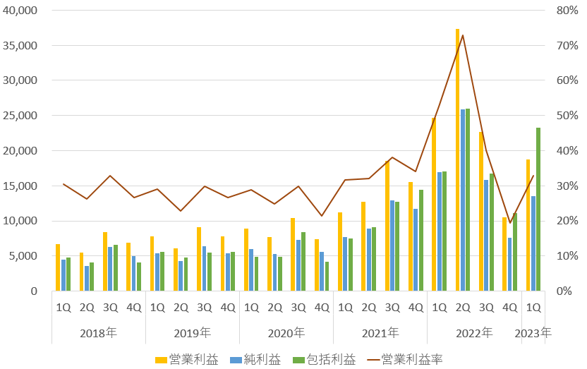 売上高、営業利益3ヵ月業績推移グラフです。
