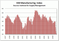 米サプライマネジメント協会(ISM)が1日発表した11月のISM製造業景況感指数は、前月より2.7ポイント下がり36.2となった。1982年5月以来、26年ぶりの低水準で、好不況の分かれ目である50を4カ月連続で割り込んだ。 項目別では「新規受注」が4.3ポイント減の27.9と、12カ月連続で悪化した。金融危機の余波で企業が人員削減を進める中、「雇用」も4カ月連続で低下。製造業の景況感悪化に伴い企業が雇用を圧縮、消費市場が冷え込む悪循環に陥っている。 原油価格の下落などにより、「価格」は25.5と11.5ポイント下落、1949年以来の低水準だった。業種別では景況感が改善したのは衣料品と製紙業界のみ。家電や化学品、食料品など幅広い産業で不透明感が増している。