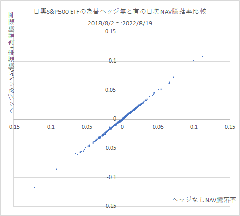 実際、横軸をヘッジなしETFのNAV騰落率、縦軸をヘッジありETFの騰落率と為替騰落率を合算したものとして、グラフにプロットすると、ほぼ一直線に並びます。