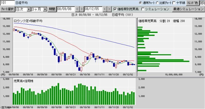 ・今晩のアメリカでで11月の雇用統計が発表となるほか、米ゼネラル・モーターズ(GM)など自動車メーカー3社の救済を巡る公聴会が行われるため、様子見の市場でした。日経平均のレンジ幅は115円と狭い範囲に。売買代金、売買高共に昨日を大きく下回りました。