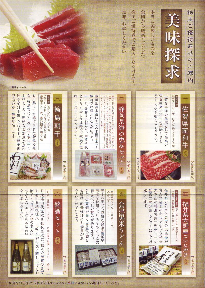 お酒の飲まない、近くに店舗が無いっと言う場合は優待券を返送することで写真の通りの商品と交換する事もできます。