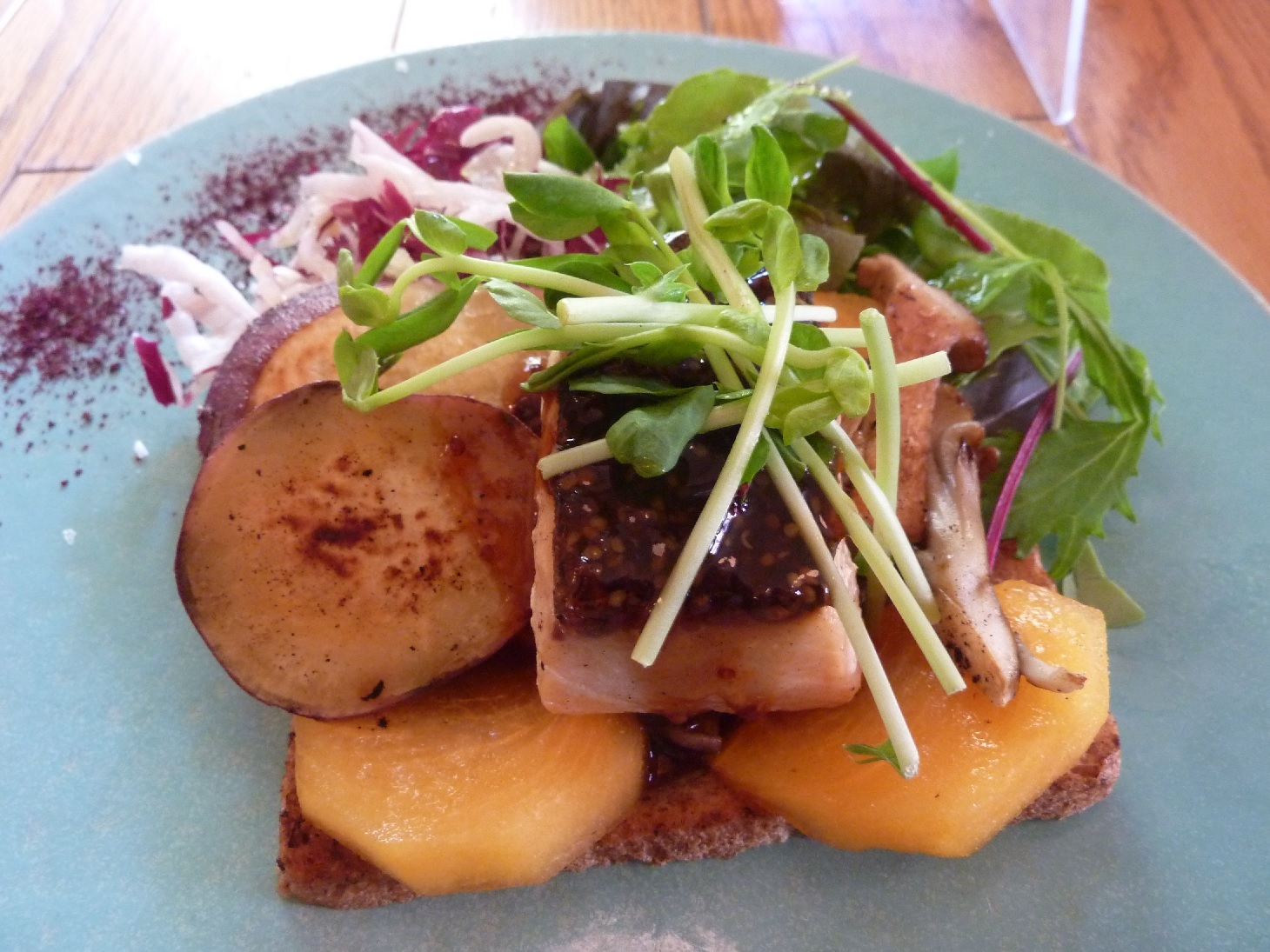 私はサーモングリルの醤油マスタードと秋野菜のスモーブロ―を注文。