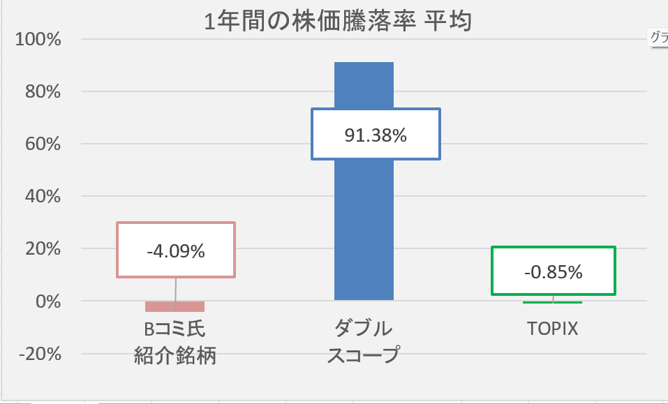 ダブルスコープに関するBコミ氏の投稿を紹介し、Bコミ氏紹介銘柄とダブルスコープ、TOPIXの株価のパフォーマンス比較をしています。