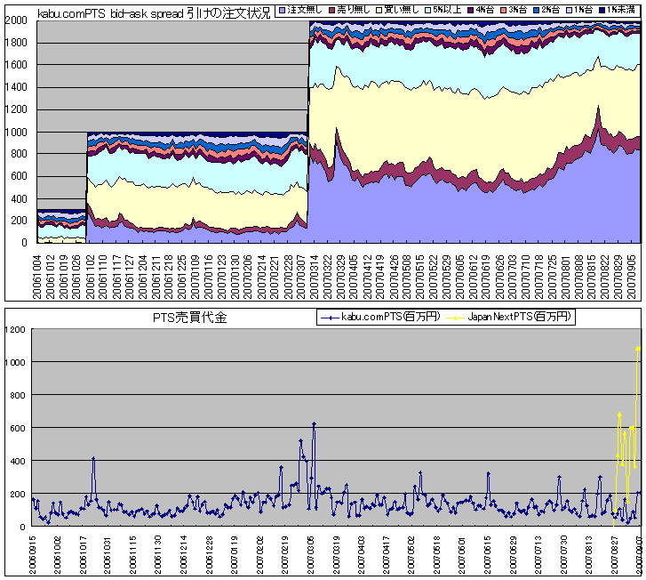 グラフは、夜間取引kabu.comPTSの初日からの売買代金と2006/10/4以降の引けの注文状況の記録です。