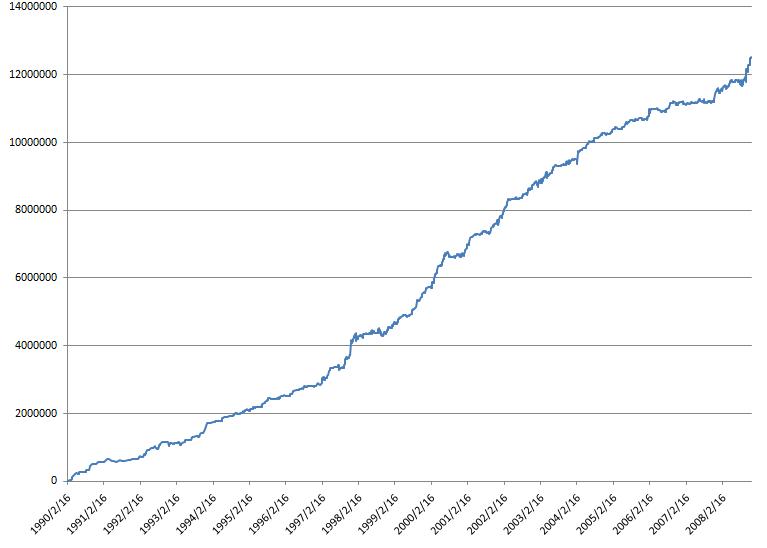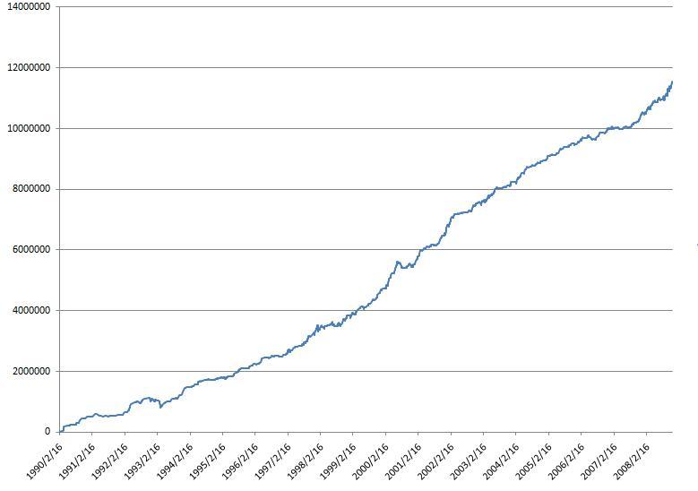 どちらも資産150万の単利投資で期間は1990-2008/12/10くらいまで。