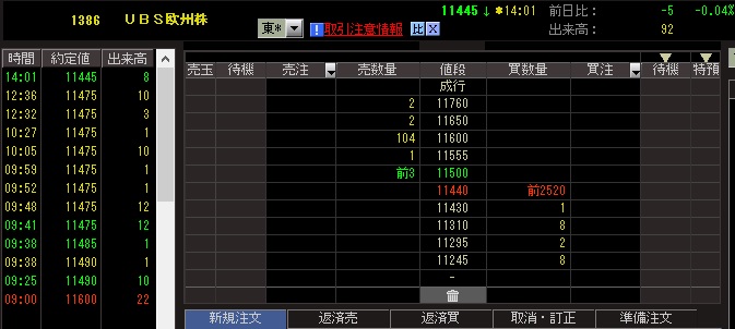 UBS欧州株(1386)の最終売買日の大引けの板です。
