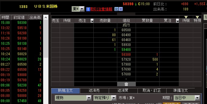 UBS米国株(1393)の最終売買日の大引けの板です。