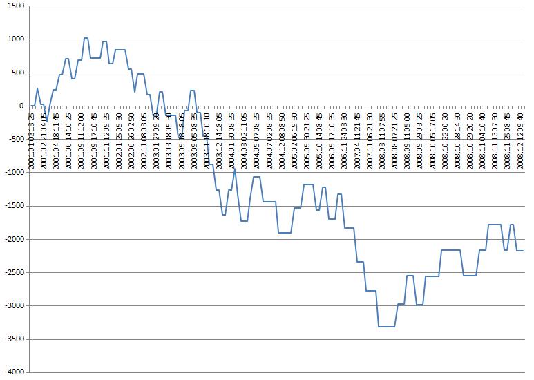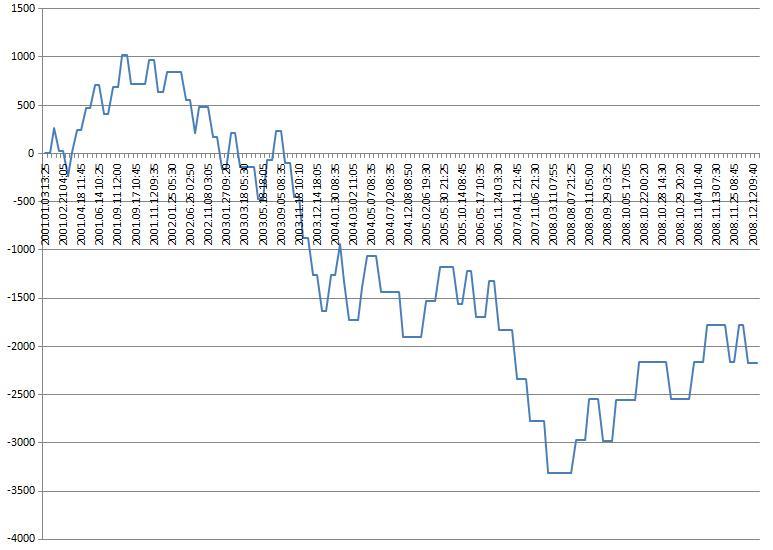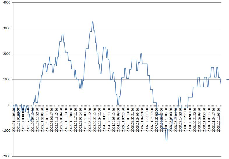 2001年から2008年という比較的長い期間で、かつ売り買い両方の売買を合わせてもたったこれだけのトレード回数にしかならない厳しい条件でさえも、Figを見れば分かるとおり、「乖離率を使用しても株式市場ほど優位性は得られない」という結果が伺えると思います。