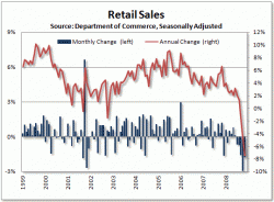米商務省が12日発表した11月の小売売上高(季節調整済み、食料含む)は3556億5500万ドルとなり、前月に比べ1.8%減少した。マイナスは5カ月連続。自動車販売の落ち込みが響いた。雇用や所得不安が消費者心理を下押ししているのに加え、自動車ローンなどの信用収縮が家計を直撃。内需の柱である個人消費は低迷が続いている。 前月比減少率は市場予測平均の2.0%よりも小さかった。10月は速報値の2.8%減から2.9%減に悪化方向で修正。11月は変動の大きい自動車・部品を除いたベースで1.6%の減少となった。例年、11月末から本格化する年末商戦は出だし不調に終わったと言えそうだ。