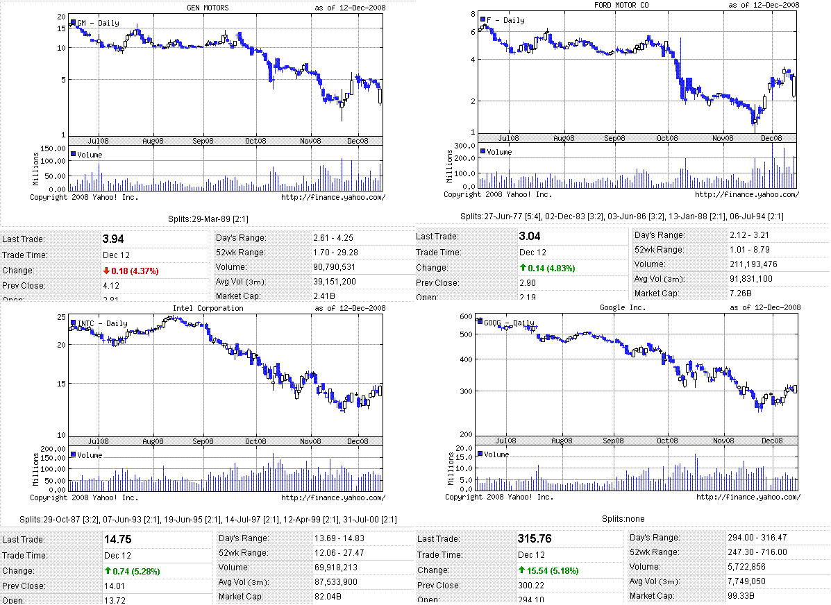 米株は反発。日本時間の昼間に、自動車メーカー救済策が廃案になったことを受けてGLOBEX米株価指数先物は大幅安でしたが、NY市場が開く少し前に、自動車メーカー救済に向けTARP活用を含めた対策を検討していると政府が表明し、米株は安寄りの後はどんどん戻していきました。次期政権で予定されている米景気刺激策では、コンピューター関連の支出が増やされそうだとペロシ下院議長が発言したため、ハイテク関連が買われ、ナスダック指数の上昇が大きかったです。