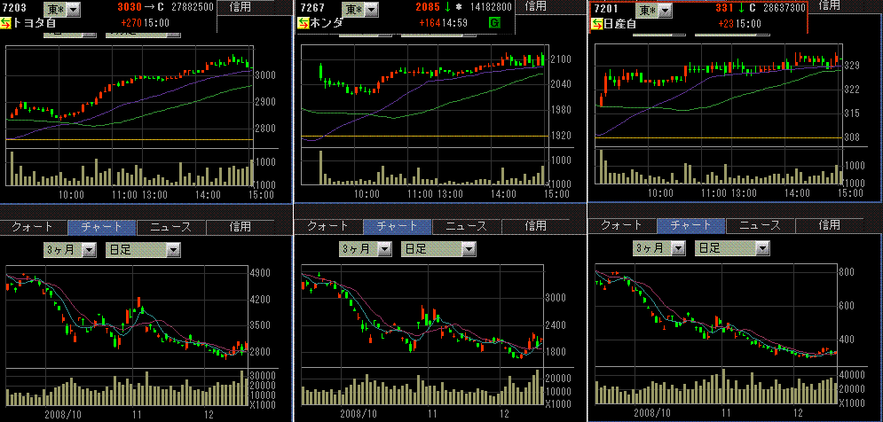 日経平均は反発。米自動車メーカーは米政府がなんとかするんでしょってことで、金曜に下げた分を取り返しました。自動車株が強かったです。金曜に空売り入れたところが買い戻したっぽいですね。東証一部出来高は18.7億株、売買代金は1.4兆円と商いは少なかったです。
