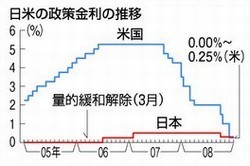 米連邦準備理事会(FRB)は16日開いた米連邦公開市場委員会(FOMC)で、最重要の政策金利であるフェデラルファンド(FF)金利の誘導目標を現在の年1.0%から大幅に引き下げ、年0.0-0.25%にすることを全会一致で決定、即日実施した。米国として史上初めて事実上のゼロ金利政策に踏み込む。同時に長期国債の買い入れ検討なども表明。市場への資金供給量の拡大を金融政策の柱とする量的緩和の導入を正式に決めた。 米政策金利の誘導目標がゼロ%台に低下したのは初めて。FF金利の誘導目標は日銀の政策金利である無担保コール翌日物金利の誘導目標(年0.3%前後)を下回った。日米の政策金利の逆転は1993年2月以来、約16年ぶりとなる。 FRBがFF金利の誘導目標に幅を持たせたのは初めて。ゼロ金利が近づき、FF金利を一定水準に厳密に日々誘導するのが困難になったためとみられる。