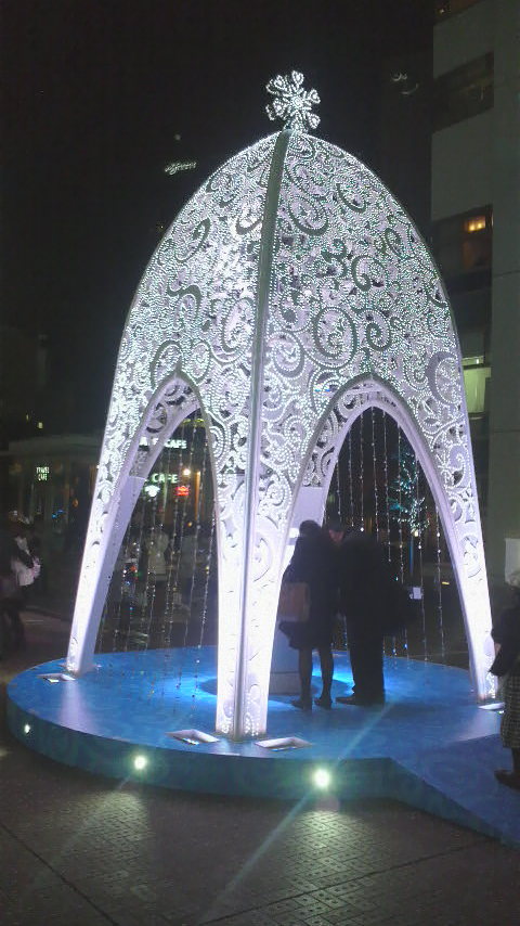 昨日に引き続き新宿南口のイルミネーション。今回はオブジェ編でござる。1、2枚目はボタンを押すとドームのイルミが変色し、色で未来がわかるのだそうで、ご覧頂いて微妙に色が変わっているのがおわかりになりますでしょうか(^^)