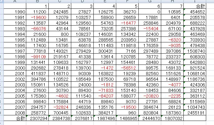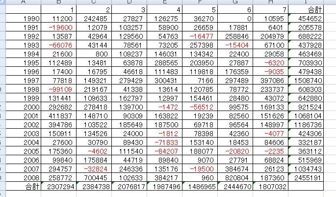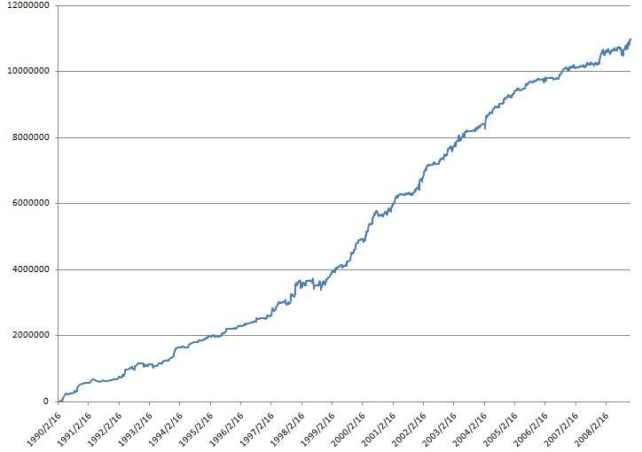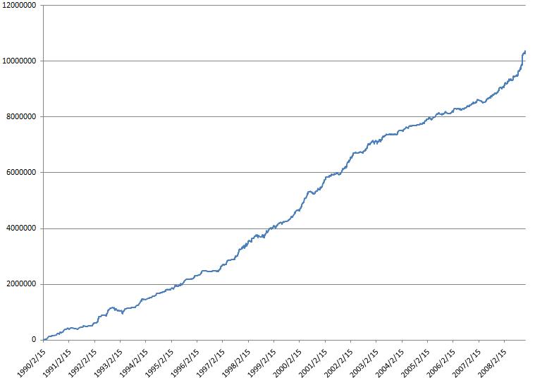 Fig2は分散投資を導入し、1つのストラテジーの一日の購入額を最大20万として合計投資額をFig1と同じく150万とし、1990年~2008年のストラテジー1~7を使用した場合の合計損益です。