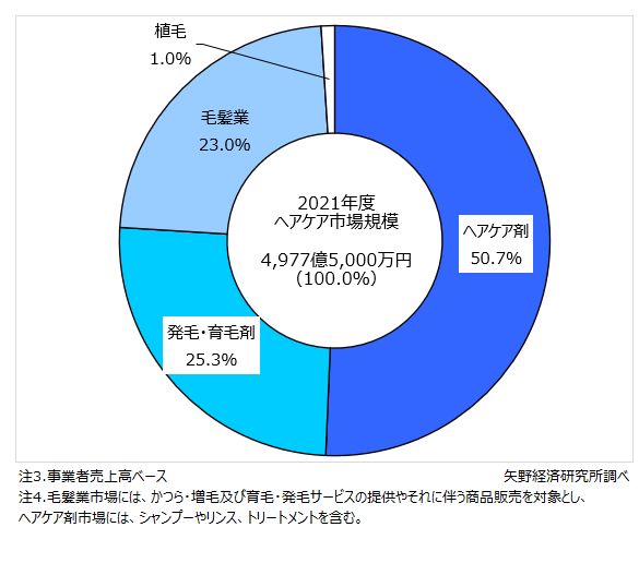 矢野経済研究所が2022年に発表したレポート「ヘアケア市場に関する調査を実施」の記事によると、「2021年度のヘアケア市場規模は前年度比109.7%の4,977億5,000万円~経済活動が回復傾向になったこと等を背景に、サロン来店客数増加や発毛・育毛剤が好調なことで市場は拡大~」と、近年微増傾向にあるようです。