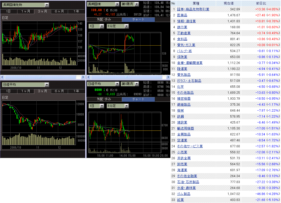 クライスラーが全工場を一か月操業停止、GMは次世代電気自動車用のエンジン工場の建設を中断、フォードは10工場で休業予定を1週間延長と、ビッグスリーは相当に厳しい様子で、GM、フォードの株価も大幅安となりました。政府による救済策は、早ければ今夜にも発表というニュースが出ていますね。政府からのコメントでは事前調整型の破産法適用も視野に入れているみたいですが、これが譲歩を引き出すための交渉用の言葉なのか、本気で考えているのか判断がつかないです。