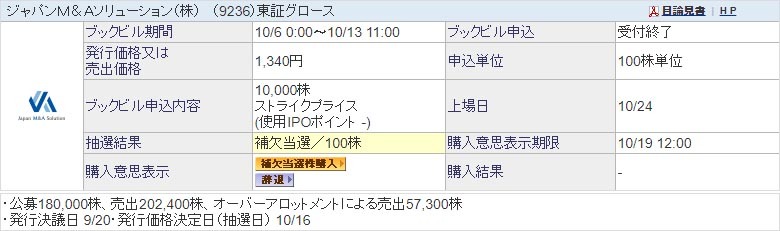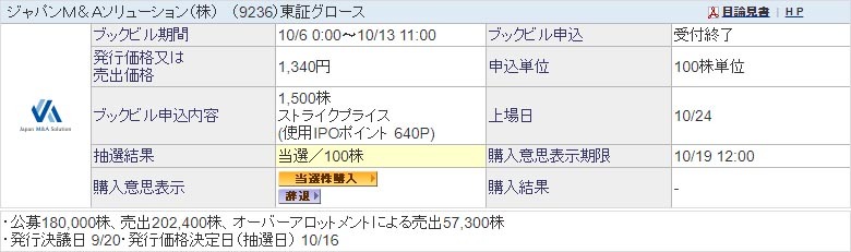 【IPO】ジャパンM&Aソリューション 650ポイント当選