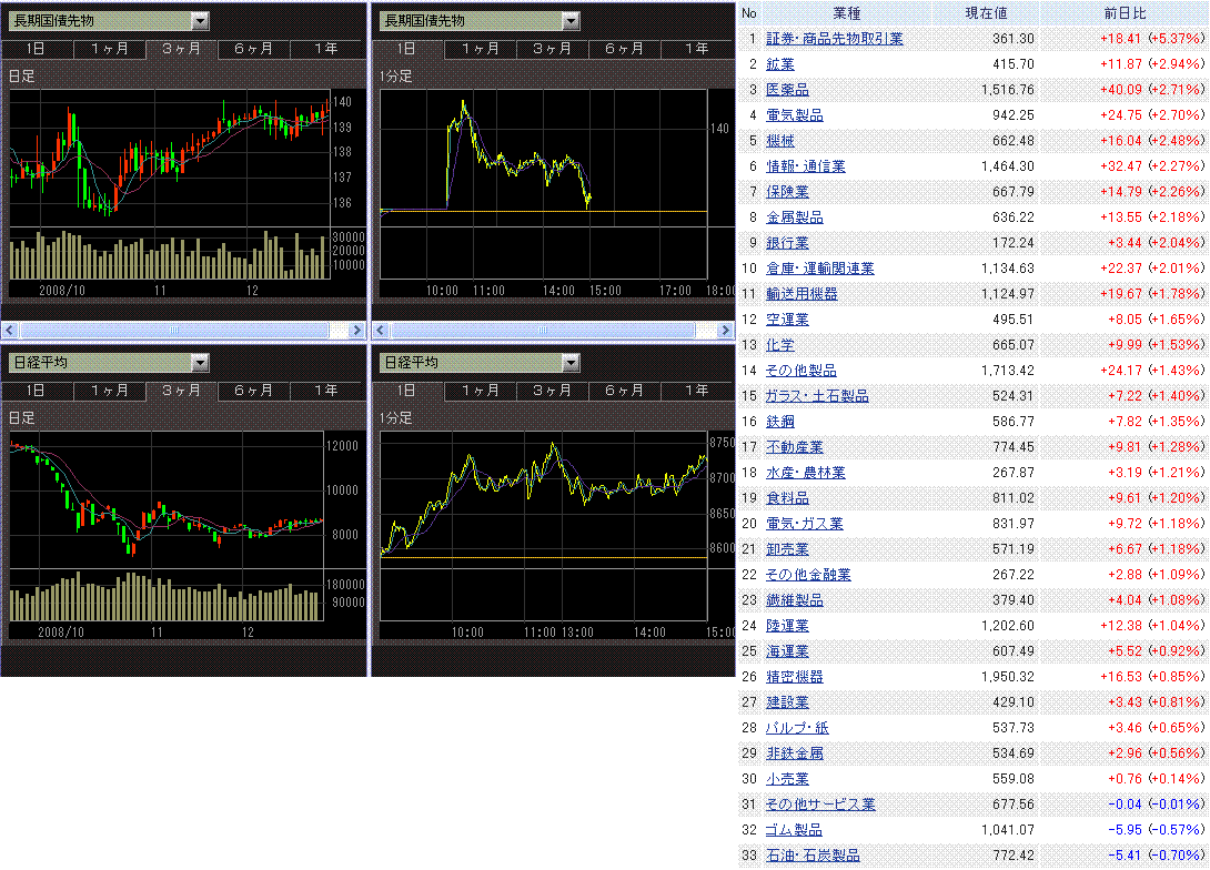 好地合いが続き日経平均は上昇。円安も追い風となったようです。業種別では、証券・銀行・保険といった金融株が強かったです。金曜のCME日経平均先物が弱かったから下がるかと思ったけど、影響ありませんでした。東証一部出来高は16億株、売買代金は1.2兆円と閑散。