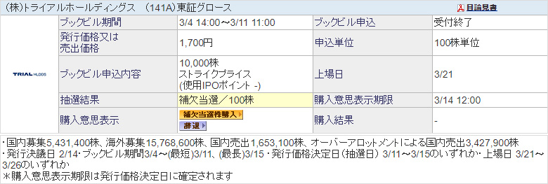 【IPO】トライアルホールディングス 当選