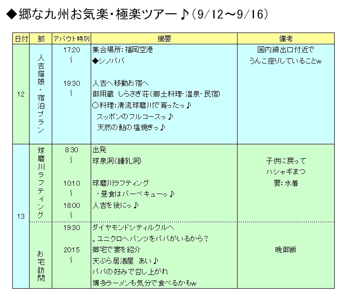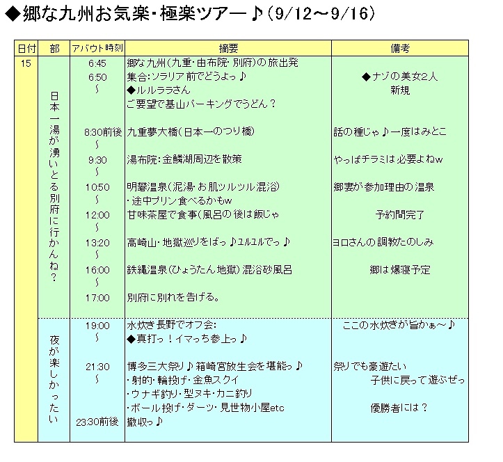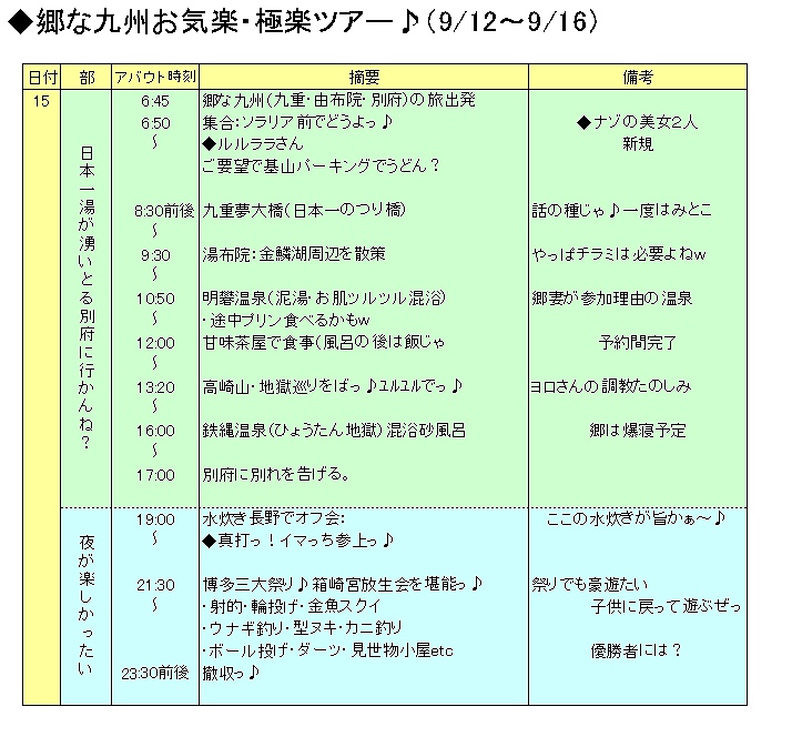 日程表は参加者にメール配布しまつ♪その前に仕事をヤッツケマッスル・・・・あたたたたたっ♪