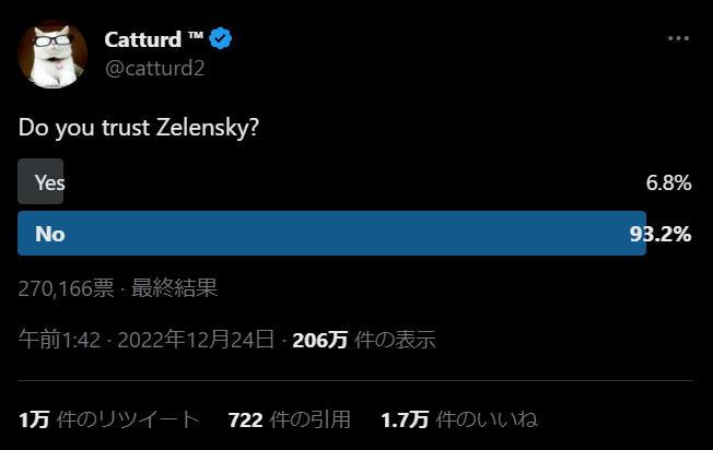 最後に米国インフルエンサーが戦争勃発後に投票しSSを貼っておきます。米国人も口に出来ないだけでみんな知ってます。
