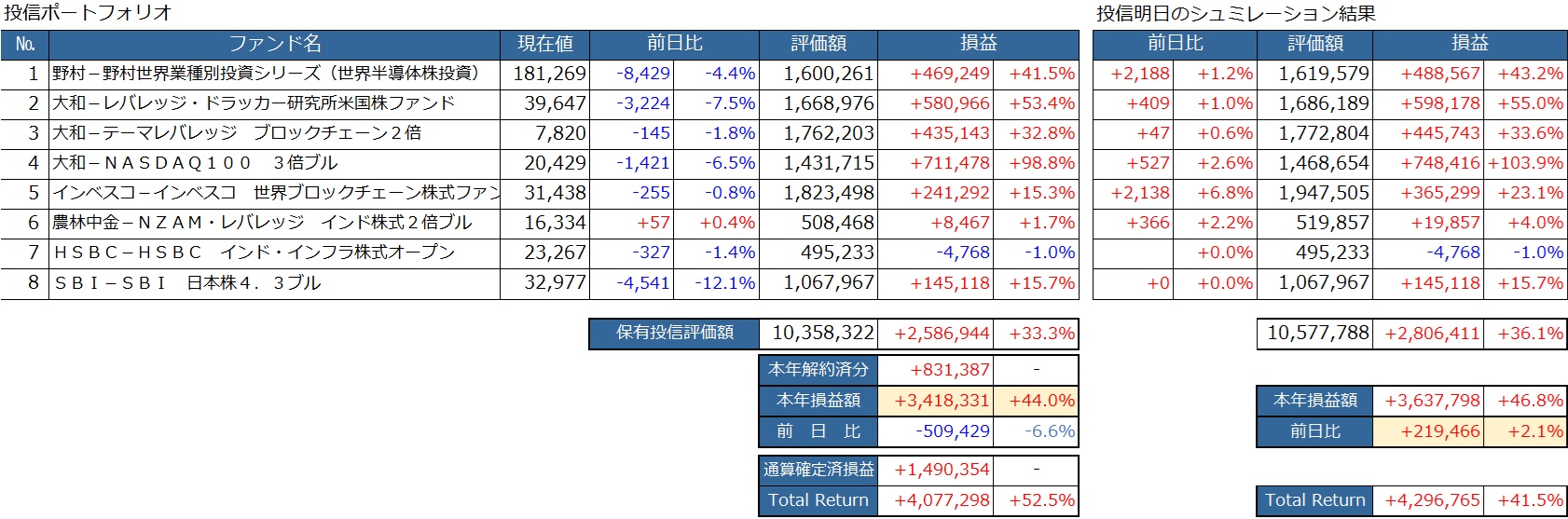 これを7/12夜の分に乗っけて(本来は7/12の騰落結果に対する%なので単純合計ではダメなんだが面倒なのでただ合計しただけ)明日の投信をシミュレーションしてみます。