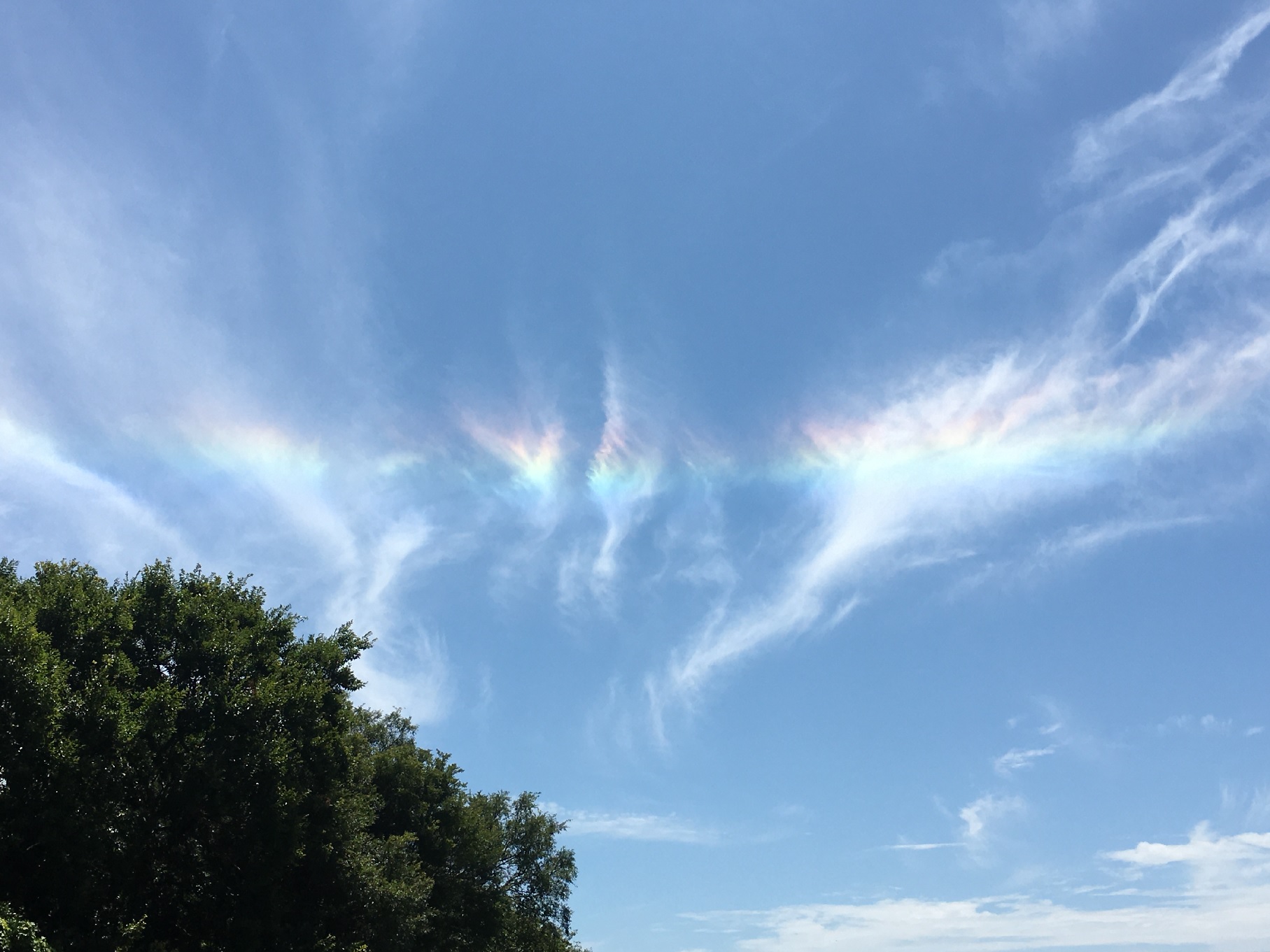 水平上の薄雲に虹色の光の帯が現れます。