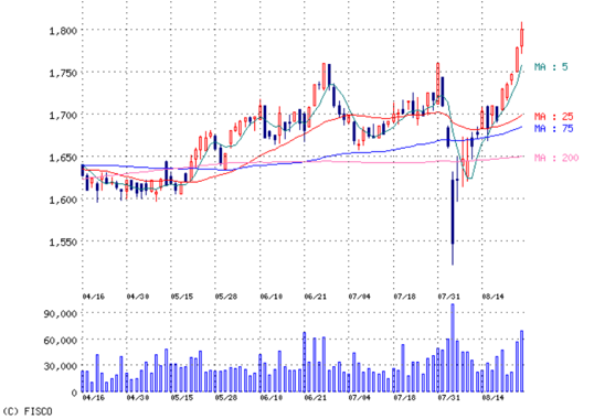 綺麗な右肩上がり。昨日下げたけど、今日上昇中。出来高もついてきてるので。