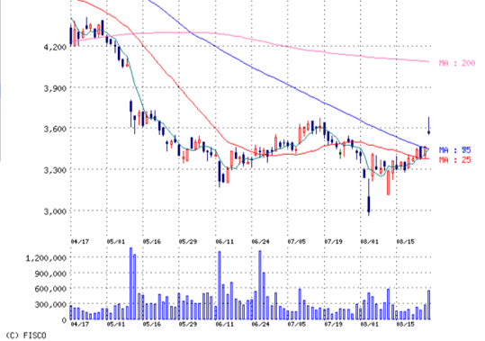 出来高増えて。3本線越えて。心配は200日線越えてないこと。
