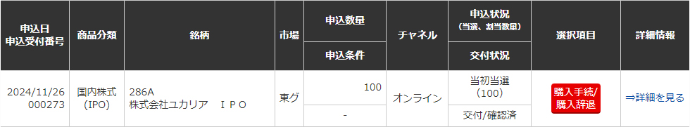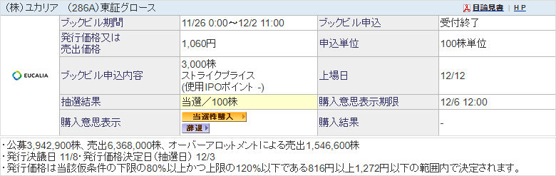 【IPO】ユカリア 当選