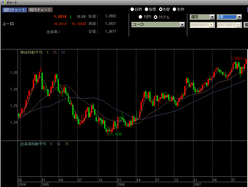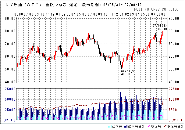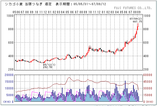 ・NY市場は小幅反落。14日に発表される色々な経済指標や18日のFOMCを控えて様子見ムード。10年債利回りは上昇。ドルが対ユーロで最安値を更新(画像1)。原油価格、WTI 80ドルにタッチ(画像2)。ついでに小麦相場も(画像3)。住宅市場の低迷もそうですが、全てアメリカの消費者にとってネガティブな方向に進んでます。各商品先物のチャートは以下で見られます。