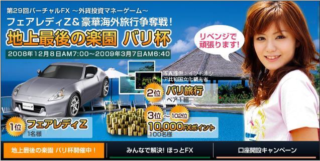 >ここのバーチャルFXでは、ただいま 「フェアレディZ&豪華海外旅行争奪戦!」を 開催中です。