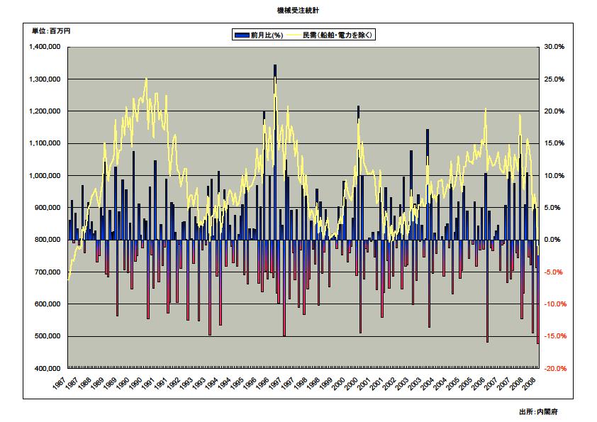 民需(除船電)の受注額は1987年7月(7343億円)の水準に戻りました。2ヶ月連続の減少となり、前月比としては1987年調査開始以来過去最大の落ち込み。特に、化学工業、鉄鋼業、造船業等の減少が目立ちました。