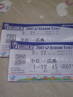 「おめとうございます。先日、店頭にてご応募頂きました、9月22日(土)中日×広島戦ペアチケット当選致しました!」