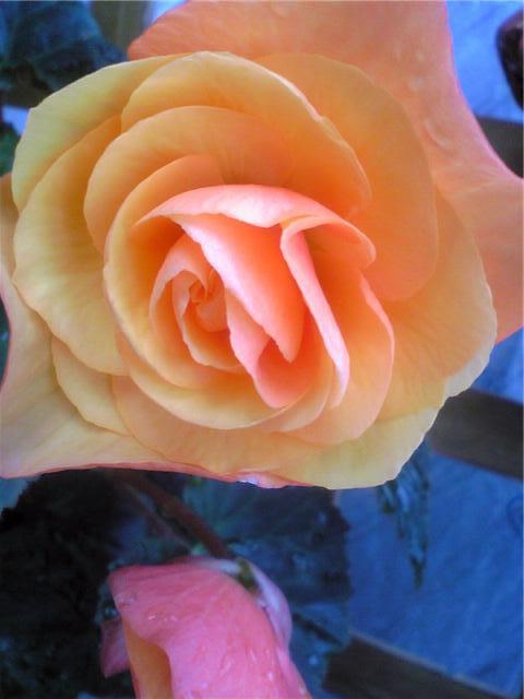 ごめんなさい、バラにもみえますね、出始めたベゴニアの一種です。かってに種から増えてるので、名前がないようです。
