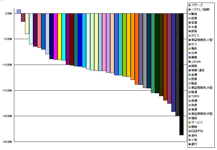 年初の初値と23日終値の東京市場の東証1部業種別、規模別、新興3市場、NK平均、TOPIXの騰落率ランキングです。