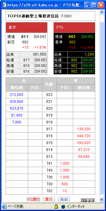 カブコムPTSで野村TOPIX-ETF(1306)がS高